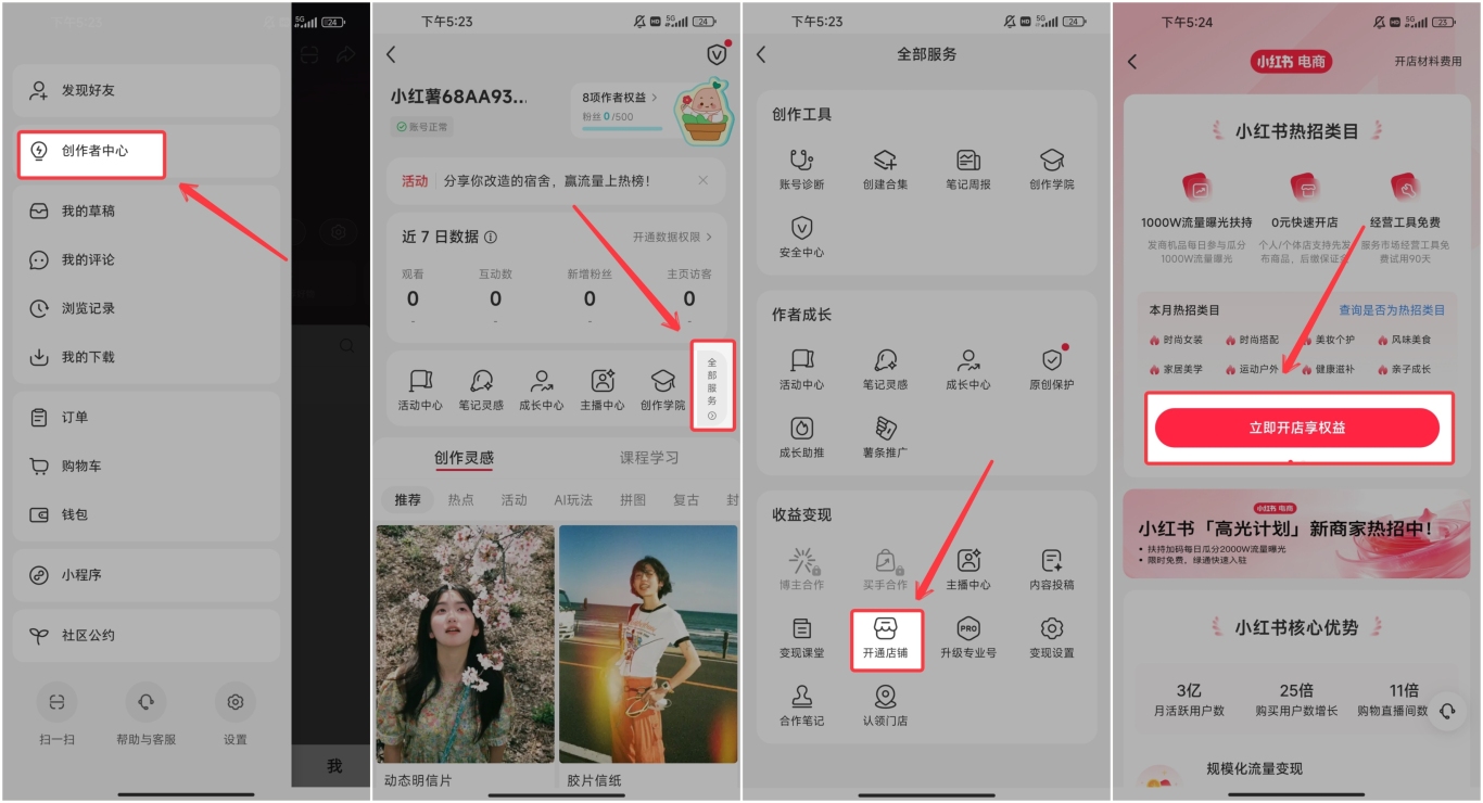 接下来就是要开通小红书店铺了,按照下图的步骤,直接开通店就可以了,整个过程不到 5 分钟就可以搞定。
