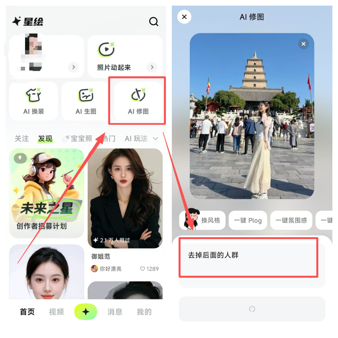打开软件后,点击【AI修图】这个功能,接着把要进行处理的照片导入进去,在命令框里面输入自己的P图需求。