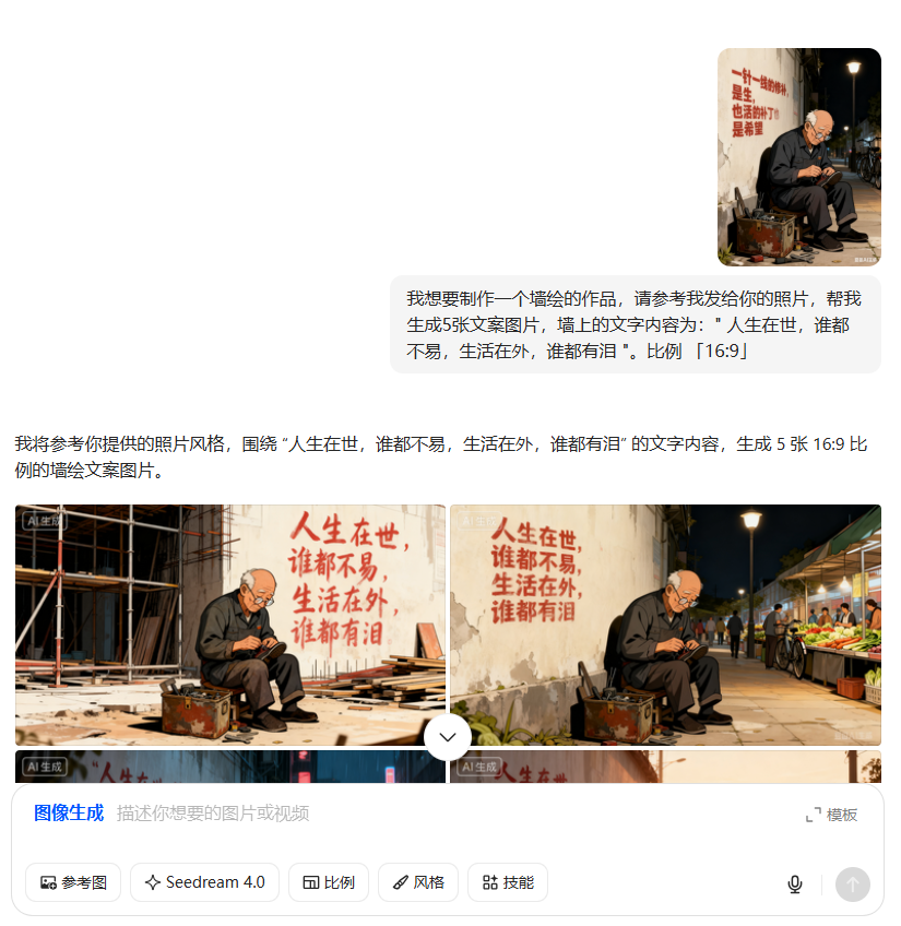 接着在输入框里告诉AI,你想要在图片里面放什么文字,具体文字的话,可以去抖音或小红书上搜索 “ 伤感文案 ”,能找到很多,基本不需要改,因为这些文案本就是别人抄书抄下来的,我们可以直接拿来用。