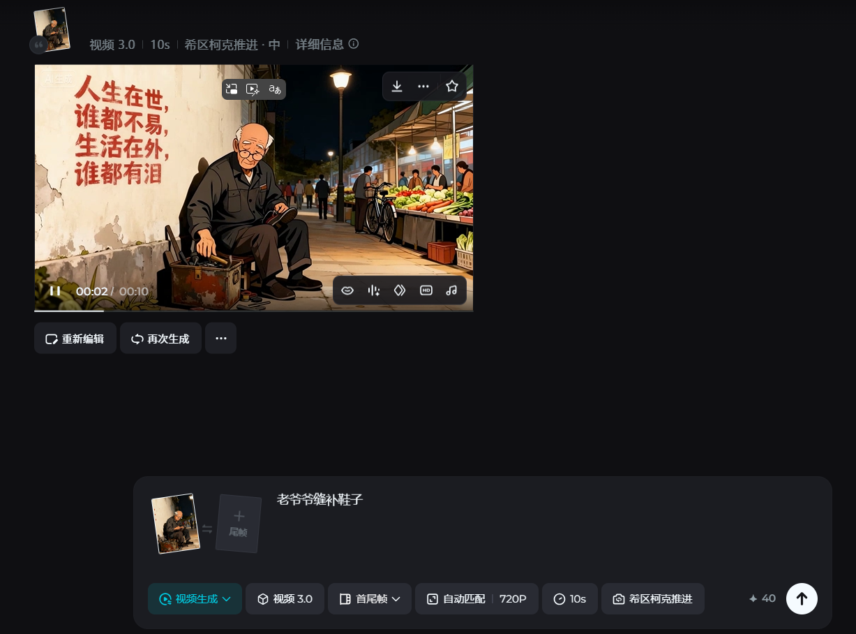 接着,咱们打开即梦AI,点击【生成 - 视频生成】的按钮,把上面去掉水印的图片导入到软件里面,简单描述一下图片里面的场景,比如:老爷爷缝补鞋子。