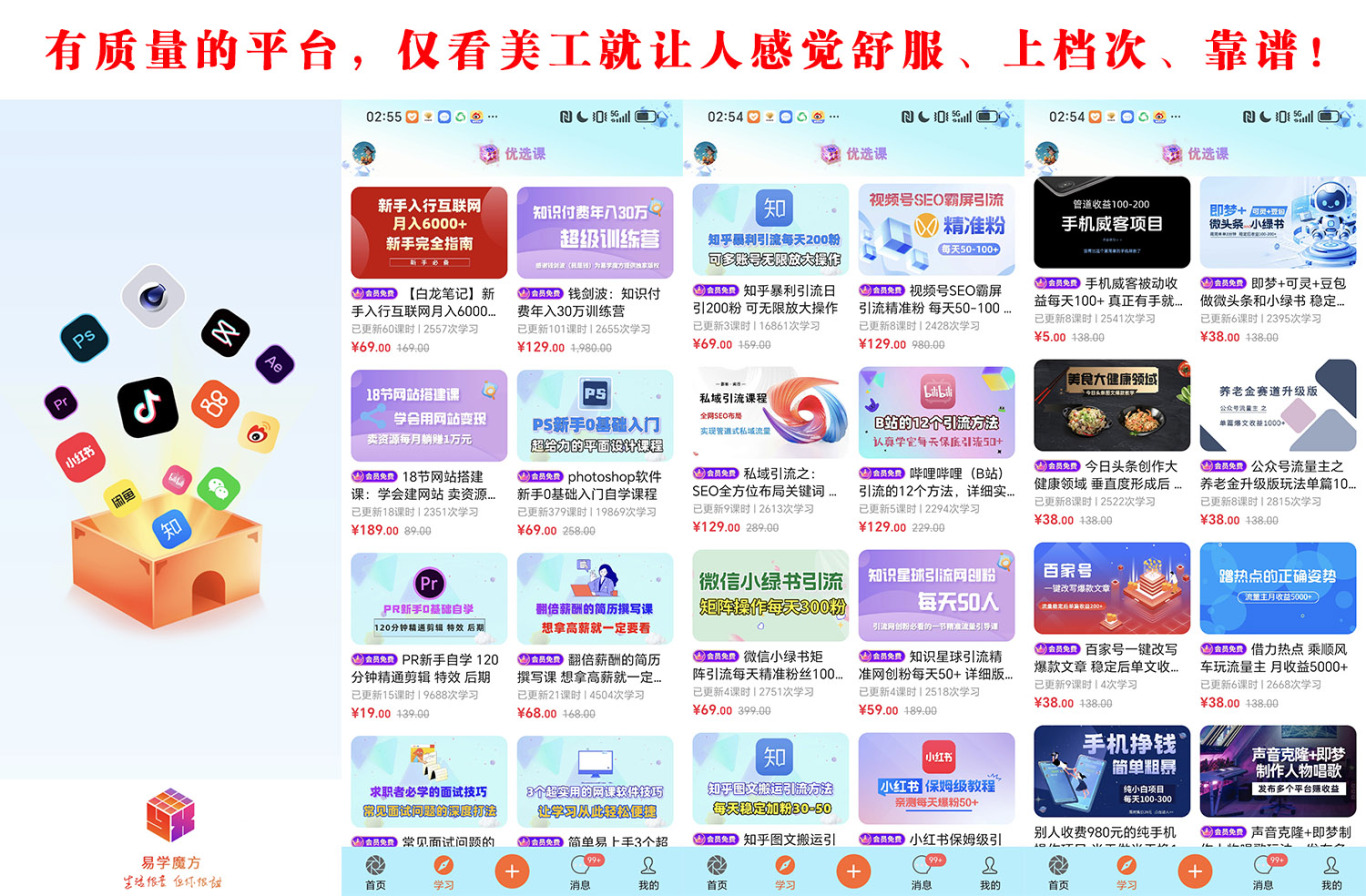 涯客圈与易学魔方APP进行深度交互,而易学魔方也是目前国内唯一拥有授课资质的纯副业类app平台,目前永久会员官方售价1980,上面的课程非盗版课程、非网盘类低端课程平台、所有课程无需下载直接在线学习,在易学魔方上学习过的人,再也不会去买其他垃圾课程!